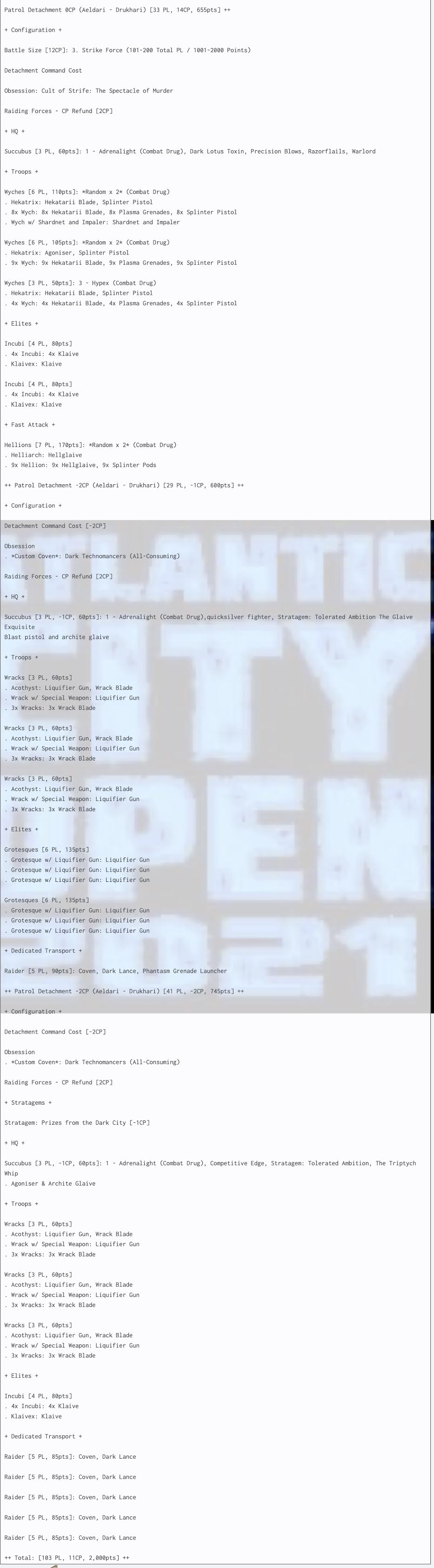 Como dijimos al principio, sorprendió la performance de los Dark Angels, a quienes por un rato pareció que los Drukhari iban a sacar del meta -está claro que no-, y la de Tau, que como facción venía muy, pero muy golpeada y sin muchas expectativas de códex a corto plazo, parecía que no había salvación; mientras que el hecho de que haya 6 Drukhari en el Top10 es exactamente lo que esperábamos. Eso no quiere decir que no haya habido otras cosas muy interesantes que se desenvolvieron con gracia en este meta tan distorsionado, y que por tanto, tras los cambios recientes, van a volverse aún mejores, como esta lista de Sascha Edelkraut, que quedó en 9 lugar pero le tocó enfrentar a todo el top 5: