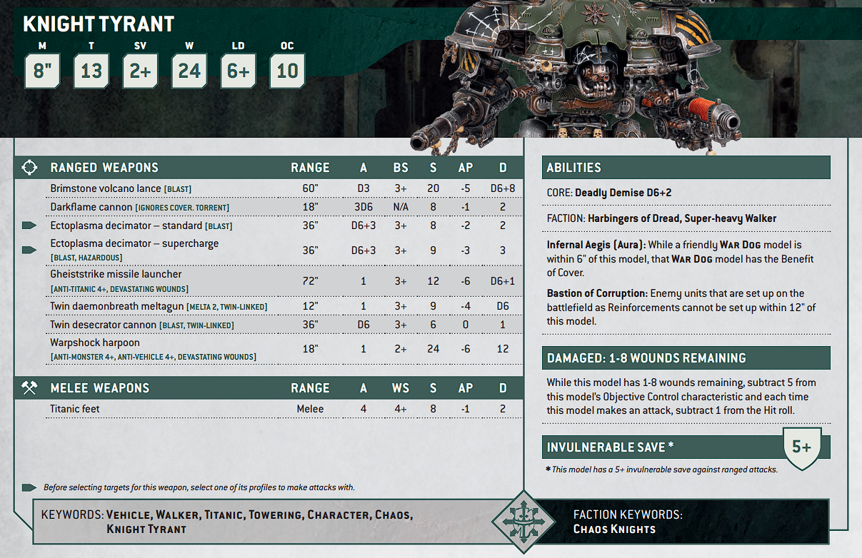 - Tirano: que se va a R13, viene con salvación de 2, bloquea el deep strike a 12" de su gigante peana y otorga cobertura a los perritos a 6". Además, tiene un cañón lanzallamas de rango 18" que es un robo en overwatch, misiles ilimitados y con la mejora de +1 a sus salvaciones hay que dispararle con FP-4 para mandarlo a la invulnerable... ¿Habrá finalmente llegado su hora? ¡Los puntos dirán!