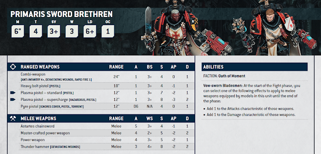 Capellan con no hay dolor de 5+++, líder de primaris incluyendo los cruzados y los Sword Brethren, dando repetir para impactar en combate a su unidad y eligiendo entre 3 habilidades cada turno: