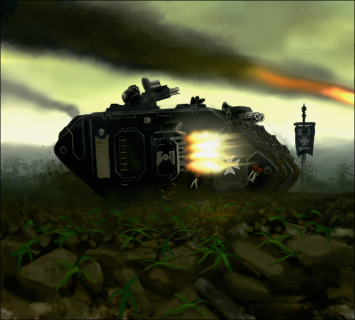 Land Raider Crusader (255 points) • 1x Armoured tracks 1x Hunter-killer missile 2x Hurricane bolter 1x Multi-melta 1x Twin assault cannon