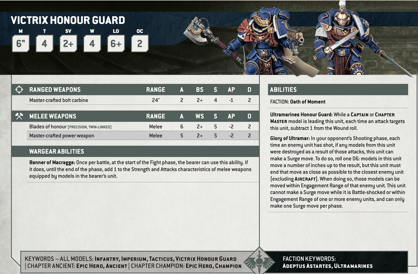 Su perfil base es de por si engañosamente robusto, pero es su absurdo coste y sus reglas de facción las que que realmente definen su impacto. Es que vistas solo por sus características, tal vez no parezcan gran cosa, pero basta compararlas con otras unidades más caras y peores para preguntarse que estaban fumando cuando le diseñaron los perfiles.