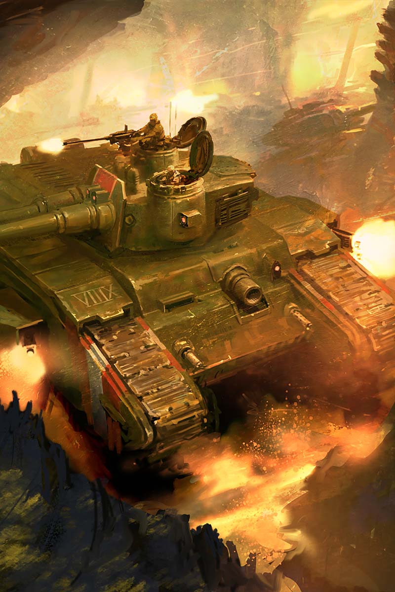 Pero lo que es el núcleo de la lista son 4 Rogal Dorn, si has leído bien, 4 moles de R12 con 18h y una 2+, que cada una dispara 1d6+3 de F12 FP-2 daño 3, 1d6 de F9 FP-3 daño 3, 2 de F9 FP-1 daño 3 y 6 de F9 FP-4 daño 1d6 melta 2, así que todas sus armas tienen lethal contra vehículos y monstruos, y salvo excepciones muy contadas, herirán a 2+ o 3+ a todo lo que no lo sea. Son 4, porqué 2 son Commander que hacen 2 órdenes a 12" a tanques, teniendo un re roll para impactar, herir y daño, mientras que los otros dos recibirán las órdenes para que los 4 tengan HP3+, y pueden ignorar un daño por partida antes de salvar, siendo los que van a ir a tomar objetivos desde el principio. Pocos ejércitos puede matar 4 Rogals y más aún pocos pueden aguatar a 4 Rogal disparando toda la partida con lethal.